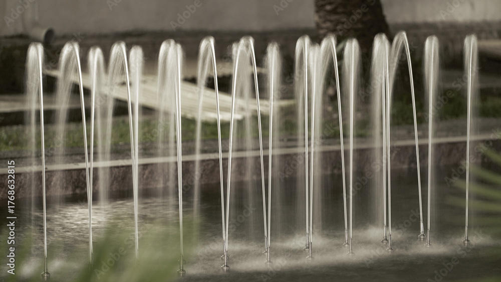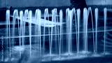 Streams of water from a fountain illuminated by a street lamp. Background image. Night shot.