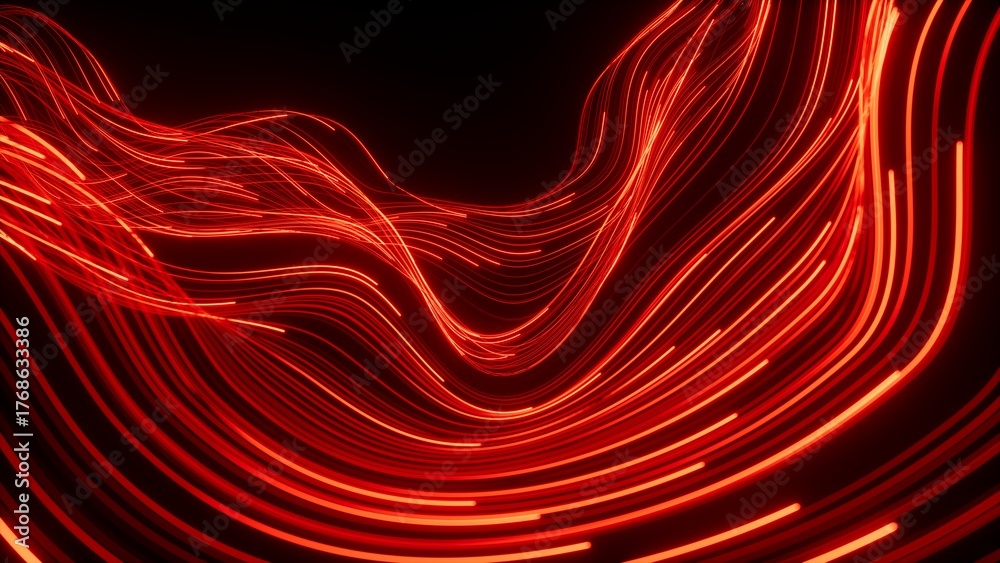 3d render, abstract background of red neon lines and wavy strings glowing in the dark. Speed of light. Fantastic wallpaper