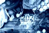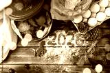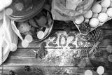Top view of chocolate ginger cookies and baking ingredients on rustic wooden table, horse-shaped cookie and “2026” written in flour, cozy festive New Year baking scene.