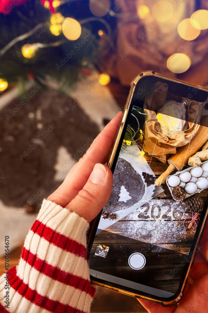 woman’s hands with smartphone making picture of cozy Christmas flat lay with chocolate ginger cookies, ingredients, 2026 written in flour. Concept of seasonal, holiday, and social media content