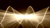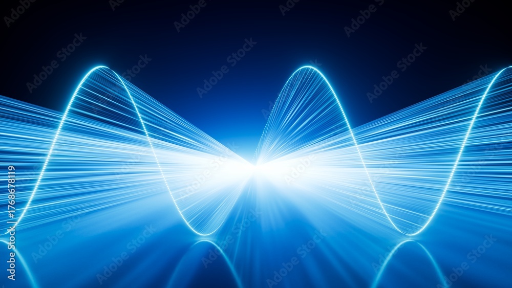 Wavy blue laser curves animate across a dark space, creating a light trail or waveform sculpture. 3D render illustration.