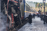 Steam train stands by the platforms.