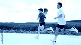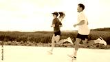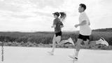 Couple jogging along a scenic path with green fields and water in the background