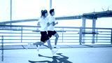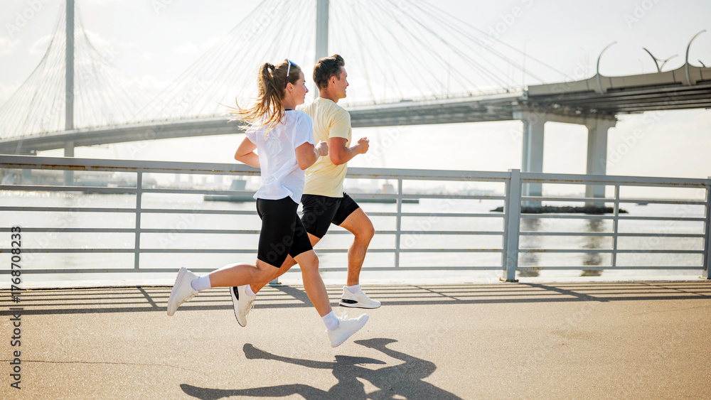 Couple jogging along the waterfront near a modern bridge on a sunny day