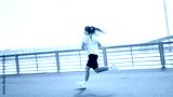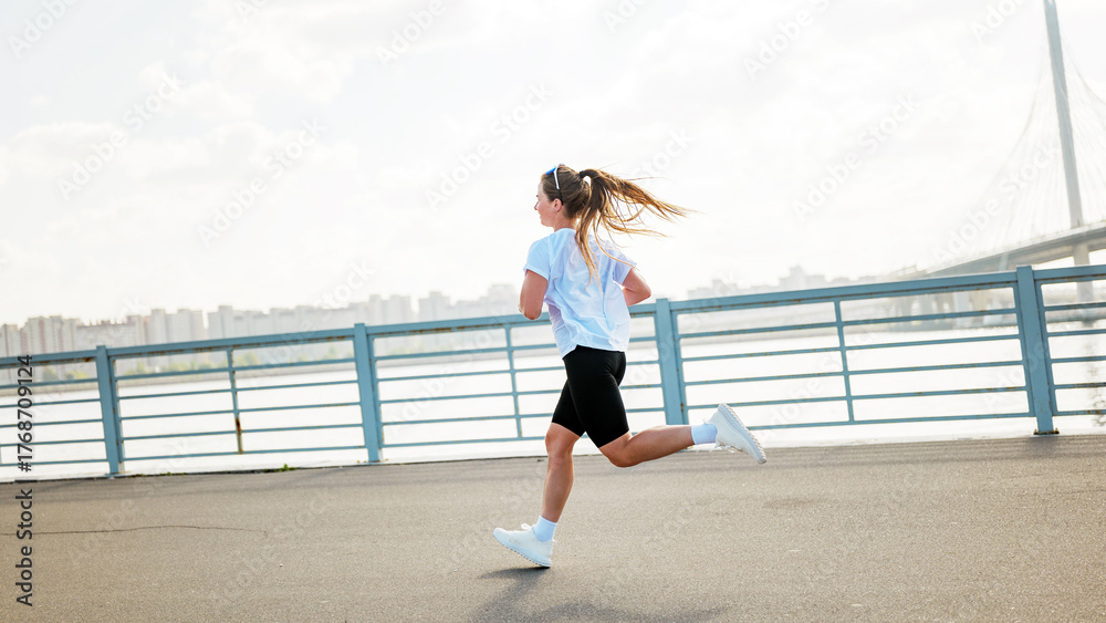 Woman jogs along riverside path with city skyline in background during morning exercise session