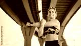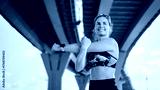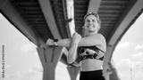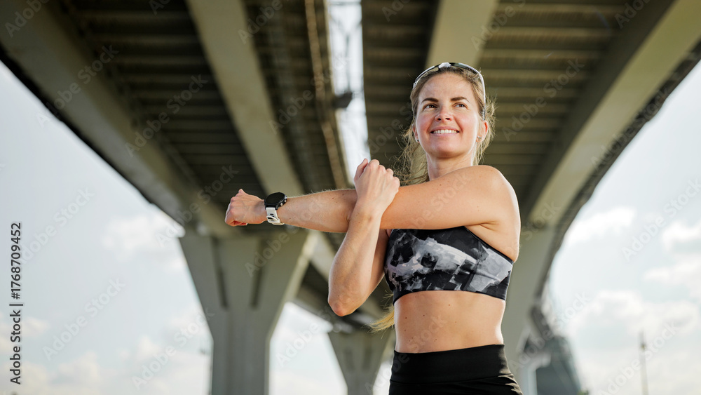 Woman stretches before workout under a bridge in an urban setting