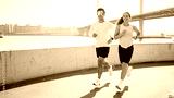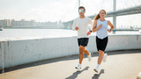 Couple jogging along the riverbank under a bridge in a vibrant urban setting
