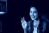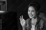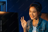Host channel Asian influencer talking in broadcast streaming online wearing headsets on social media with pc recording, greeting listeners and coaching market online at neon modern studio. Stratagem.