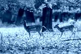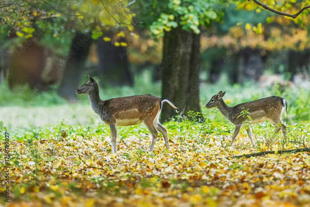 Fallow deer Dama dama females walking through forest with autumn leaves