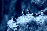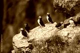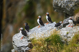 Atlantic Puffin Fratercula arctica colony resting together on rocky cliff ledge surface