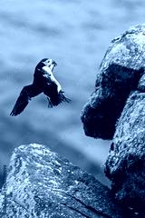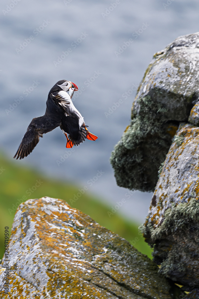 Atlantic Puffin Fratercula arctica landing near rocky cliff covered with sea moss