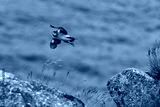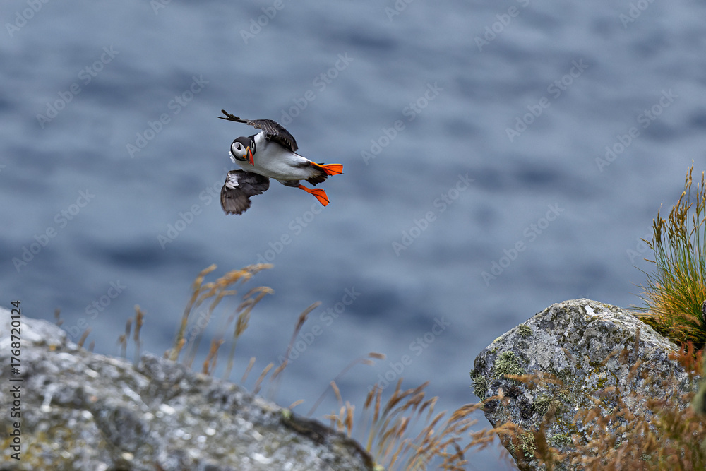 Atlantic Puffin Fratercula arctica flying above rocky cliff edge with sea background view