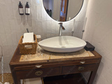 Stylish sink on wooden vanity in restroom interior. Cleanliness, design harmony, and comfort in modern hospitality environment.