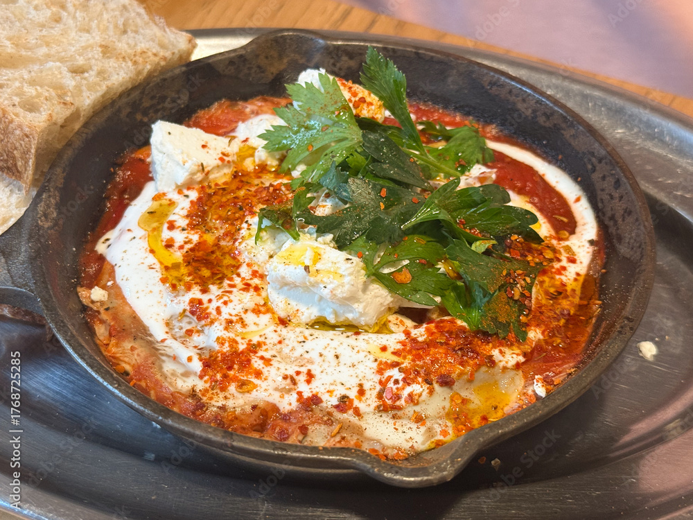 Breakfast with shakshuka, bread and cappuccino on wooden table. Food and Mediterranean flavors in cozy cafe setting.
