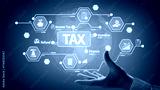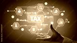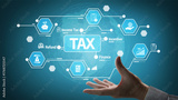 This image represents digital tax management, showcasing various financial terms and concepts against a blue background, ideal for financial technology and services. Tessel