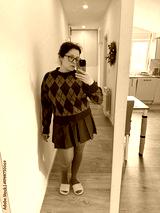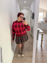 Woman in red argyle sweater and brown skirt taking mirror selfie at home. Cozy outfit, warm light, and casual autumn style.