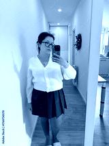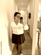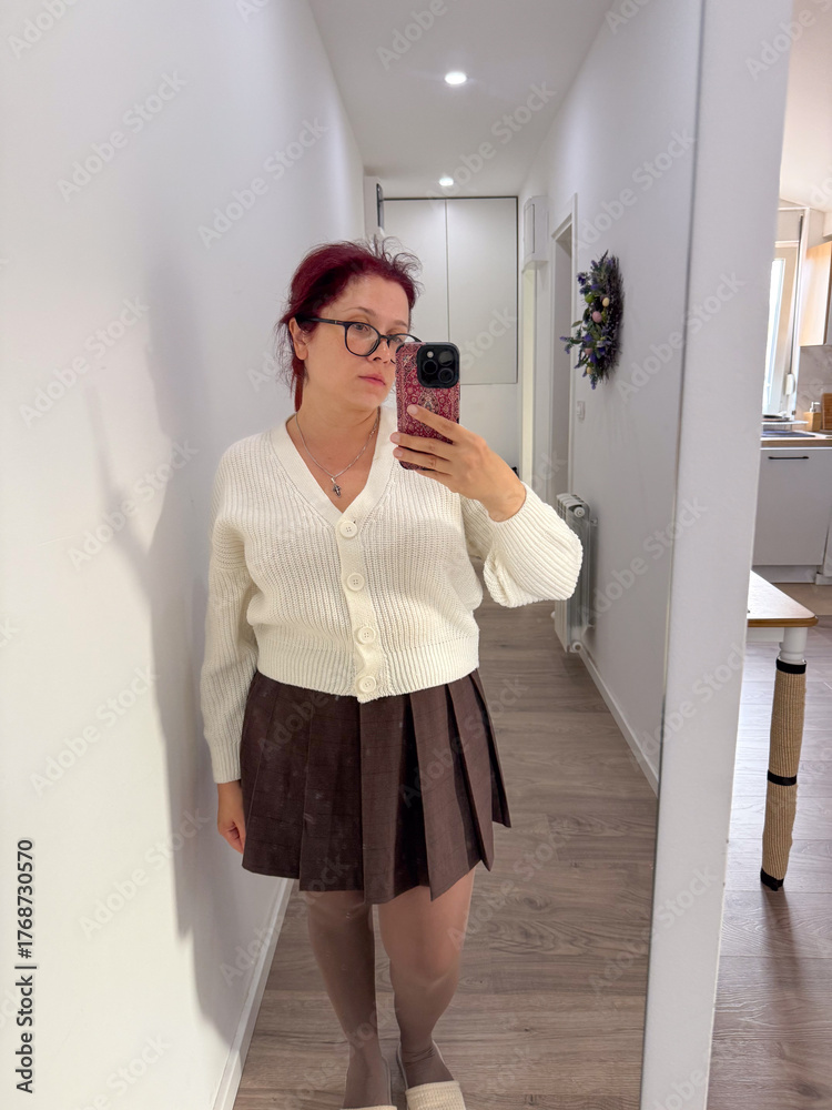 Woman in white cardigan and brown skirt taking mirror photo. Light tones, home interior, and balance of color and texture.