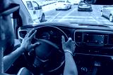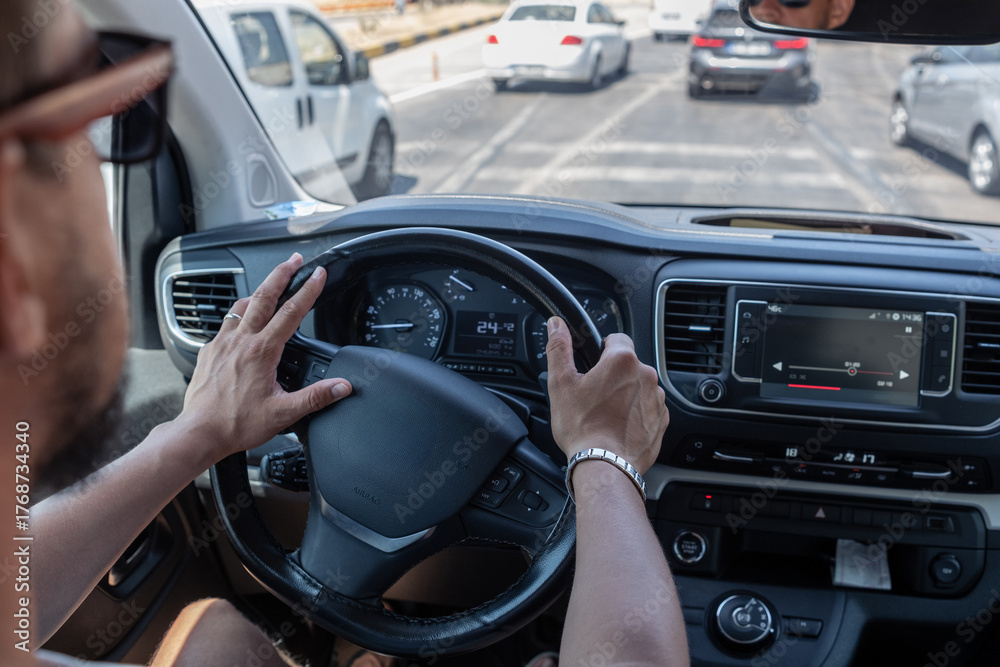 Driver Focused on Road While Navigating Through Busy City Traffic During Daylight Hours