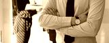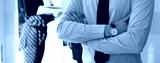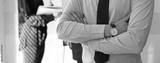 Confident businessman standing with arms crossed at a corporate meeting, leading a team of professionals discussing business strategies and plans in an office workspace