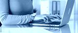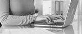 Woman freelancer working with digital tablet, browsing information, using online technology in modern office. Audit and taxes in business
