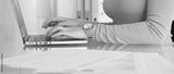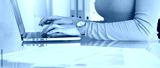 Woman focusing on her work, typing on a laptop keyboard, sitting at a glass desk with paperwork and folders, managing digital and administrative tasks in a modern office environment