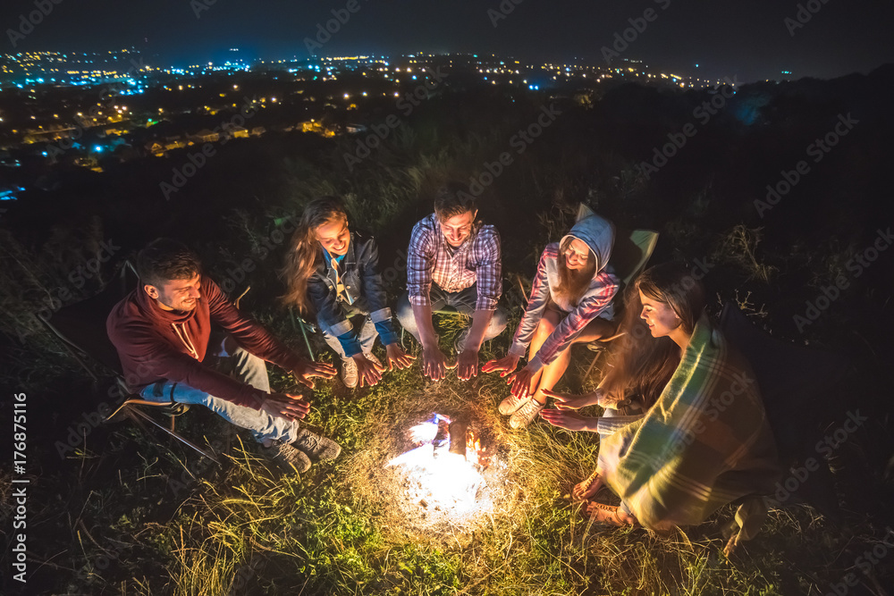 The five friends warming near the bonfire. evening night time