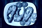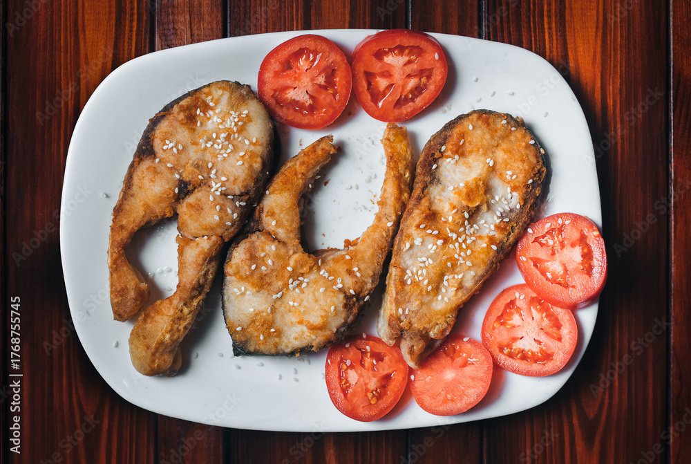 Pieces of fish with sesame seeds, fried in oil, served on a white plate with tomato slices. Natural wooden table. Perfect for breakfast, lunch, or dinner.