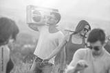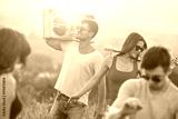 The happy people dancing with a boom box on the bright sun background