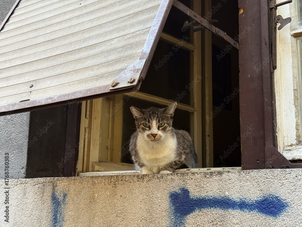 Tabby cat sitting on windowsill outside old house. Curiosity, observation and street atmosphere with architectural details and character.