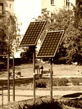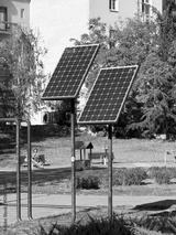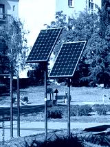 Solar panels installed in urban park. Renewable energy, sustainable technology and eco-friendly infrastructure in public space.