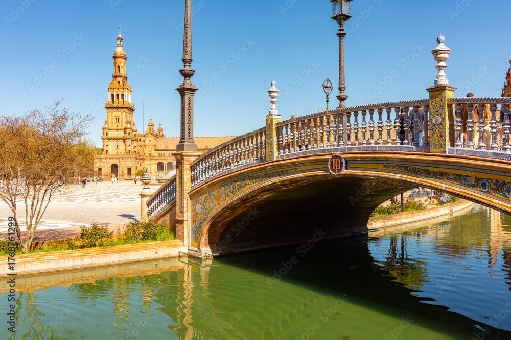 Decorated bridge on Spain square in Maria Luisa park, Seville, Spain