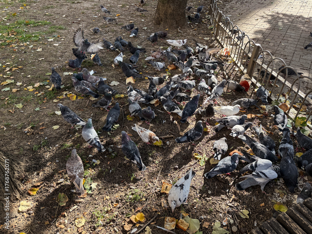 Pigeons gathering under tree and feeding near fence. City wildlife, collective behavior and urban ecosystem captured in daylight setting.