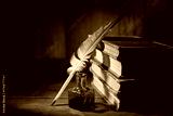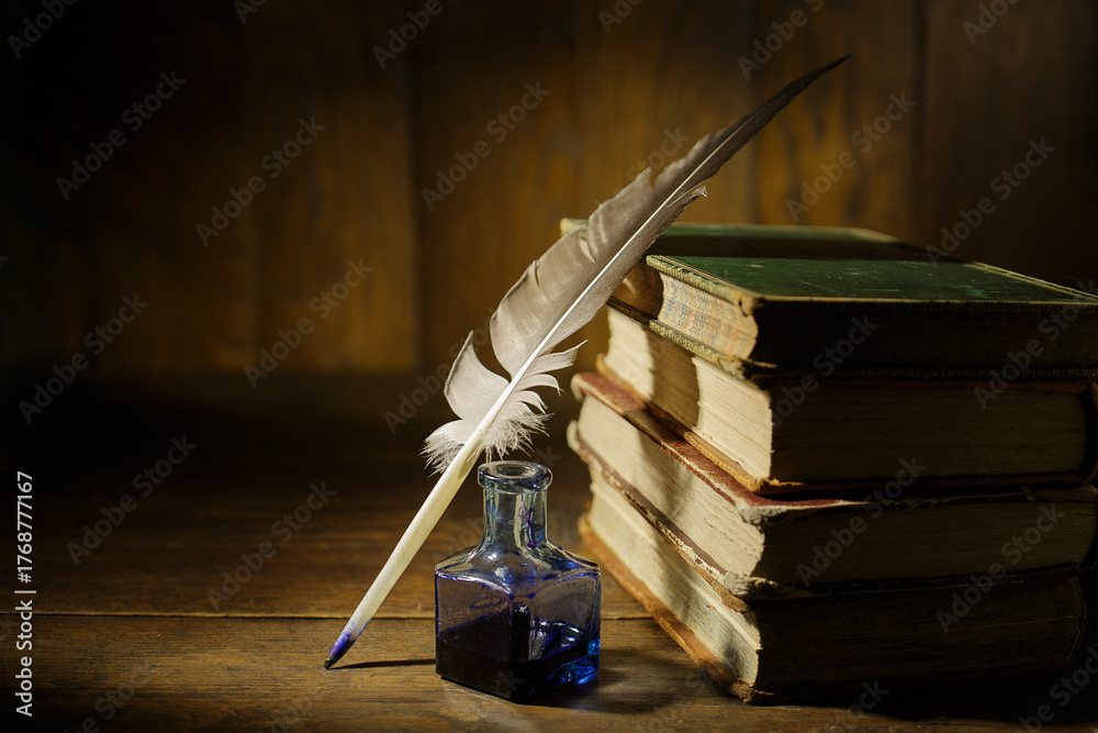 Old antique books with feather and ink bottle on old wooden table. Feather for calligraphy, old education, vintage still life