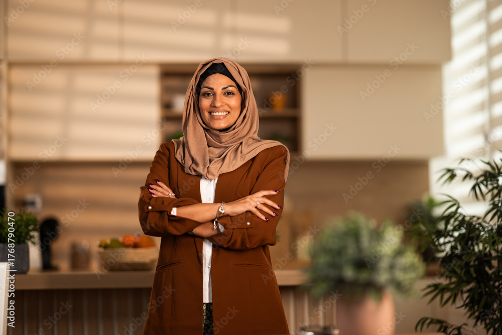Confident Hijab-Wearing Woman In Brown Jacket Stands With Arms Crossed