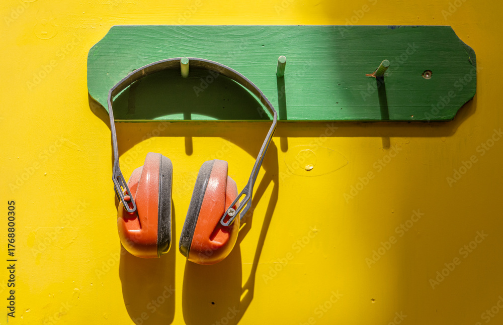 Bright yellow wall with green shelf and red ear protection headphones