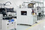 SMT placement machine in a modern electronic manufacturing facility during daytime operations