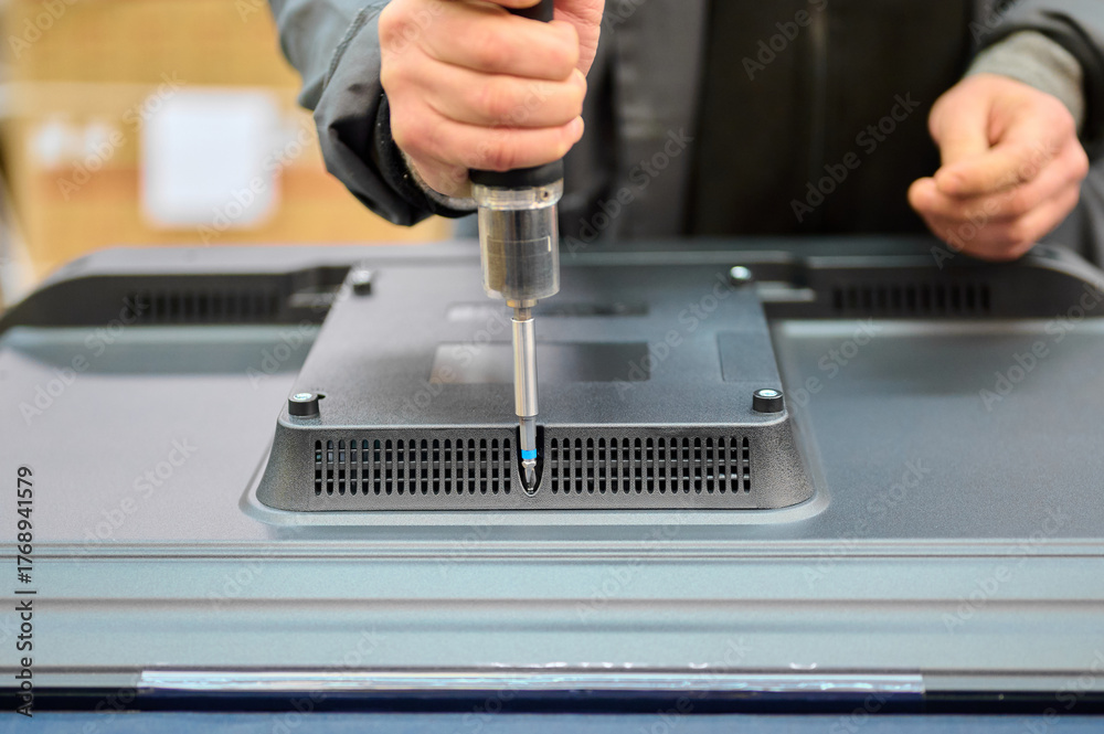 Workers assemble television housing at television assembly plant, focusing on construction details and quality control