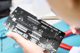 Close-up of a technician carefully soldering components on a printed circuit board in a well-lit workshop setting