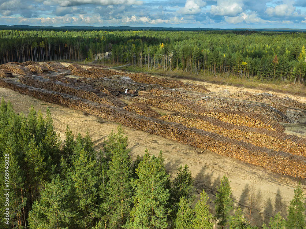 Temporary timber storage facility surrounded by dense forest during a clear day