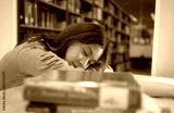 A teenage girl sitting on the table of a library, searching information and reading for the book