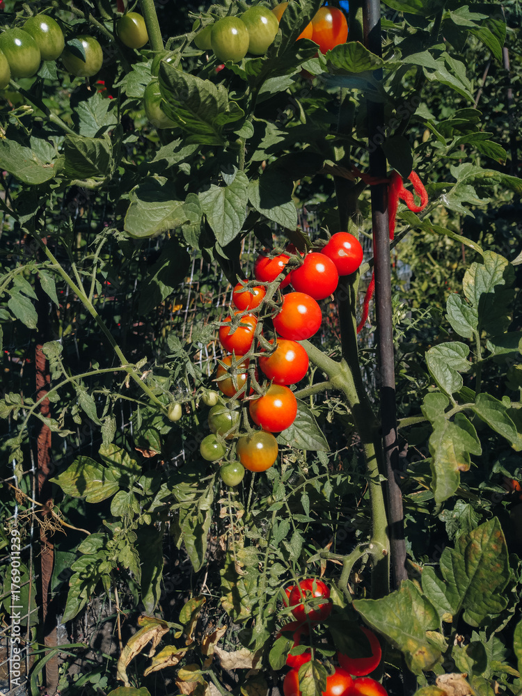 Several small, ripe red tomatoes hang on a raindrop-covered branch. Autumn. Gardening concept and a small vegetable garden in the yard.