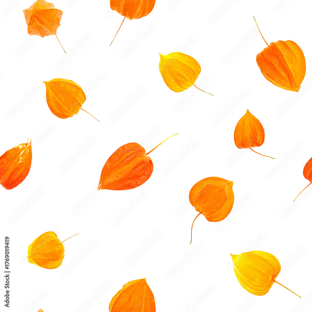 Seamless pattern of orange physalis lantern fruit on white background in macro detail