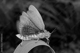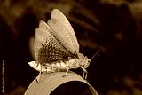 A colorful milkweed locust (Phymateus spp.) sitting on a plant with open wings, South Africa