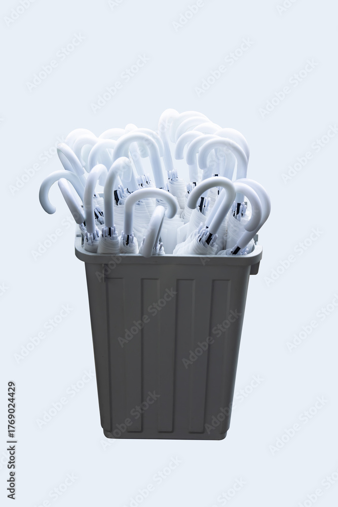 Folded Umbrellas with white Handles in Large grey Plastic Basket
