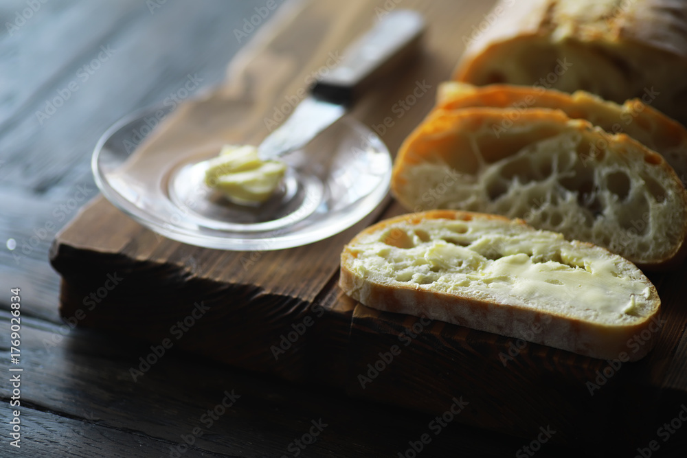 Slices of Freshly Baked Bread with Butter on Wooden Cutting Board