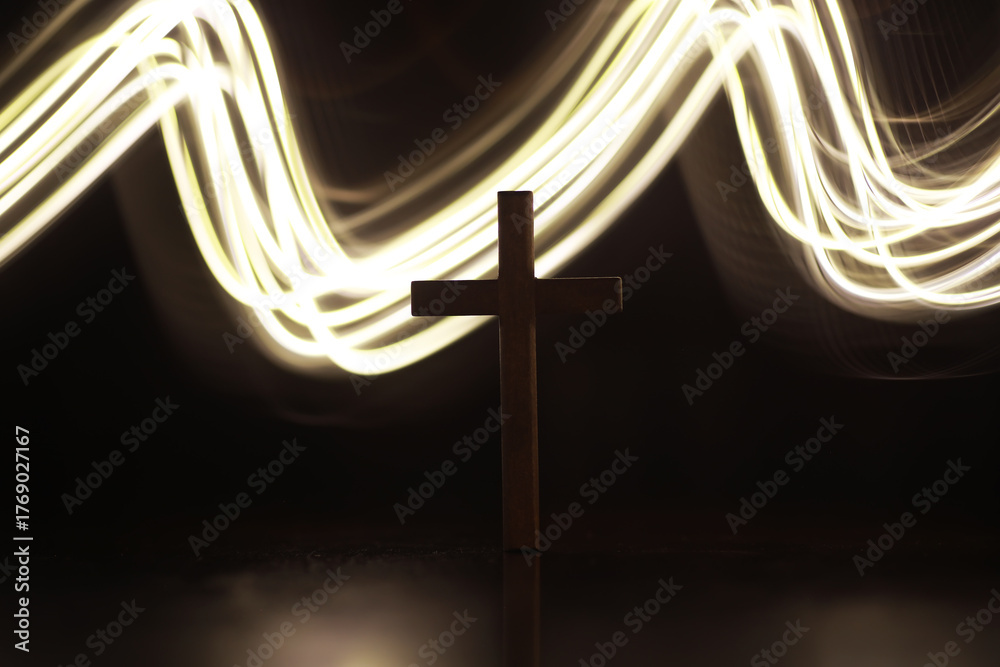 Silhouette of Cross with Dynamic Light Trails in the Background Symbolizing Spiritual Upliftment