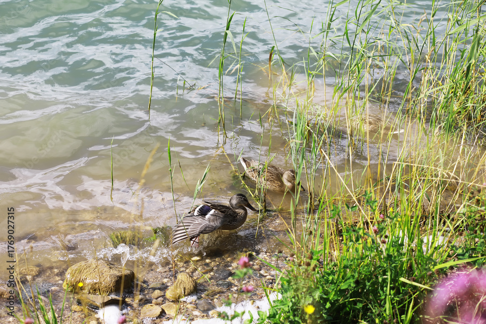 Two Ducks in Natural Lake Habitat with Tall Grasses and Clear Water Shoreline