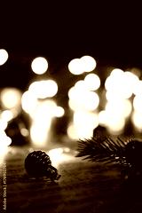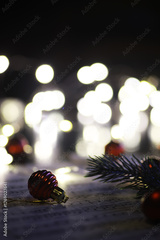 Festive Christmas Decorations with Lights and Ornaments on Sheet Music
