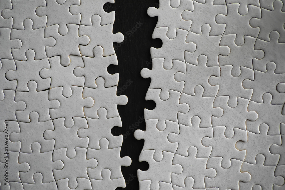 Separated White Puzzle Pieces on Black Background with Irregular Gap in the Center