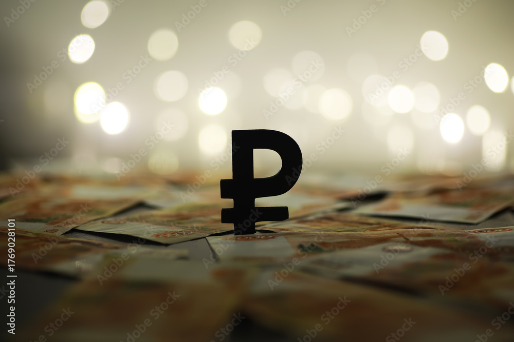 Russian Ruble Symbol with Blurred Banknotes and Festive Lights in Background